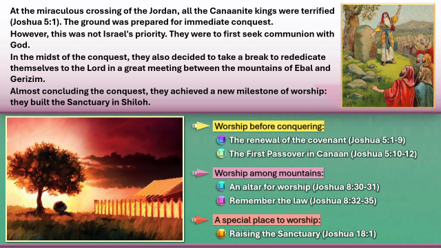 September 3, 2025| Dear Church Family, This week, we review important events during the conquest when Joshua led the Israelites to recommit themselves to the Lord. These events are centered on rituals, which are a powerful way to convey tradition and values, create meaning, and express emotions. In the biblical ritual, another crucial element is the prophetic one, which points to Christ and the realities brought about by Him. Below, we delve deeper into the rituals of circumcision and Passover, performed by Israel right after the crossing of the Jordan River, and the building of altars in the context of the renewal of the covenant in the book of Joshua. As we review these ceremonies, we can reflect on their significance in the past and their relevance to those living on the brink of the heavenly Canaan. |